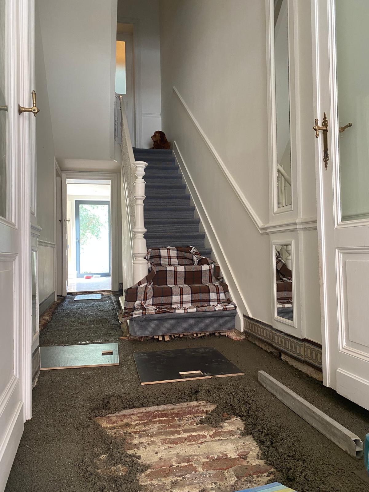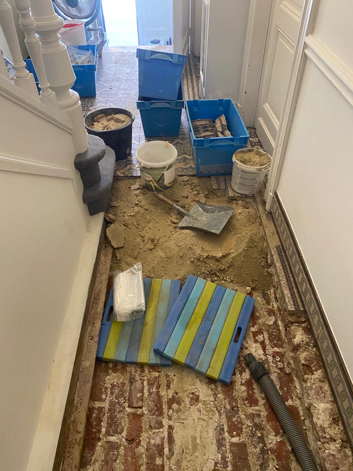 Le lit de sable jaune a été remplacé par une chape à liant hydraulique puis pose d'un tapis de dilatation avant la repose des carreaux par un double encollage.
