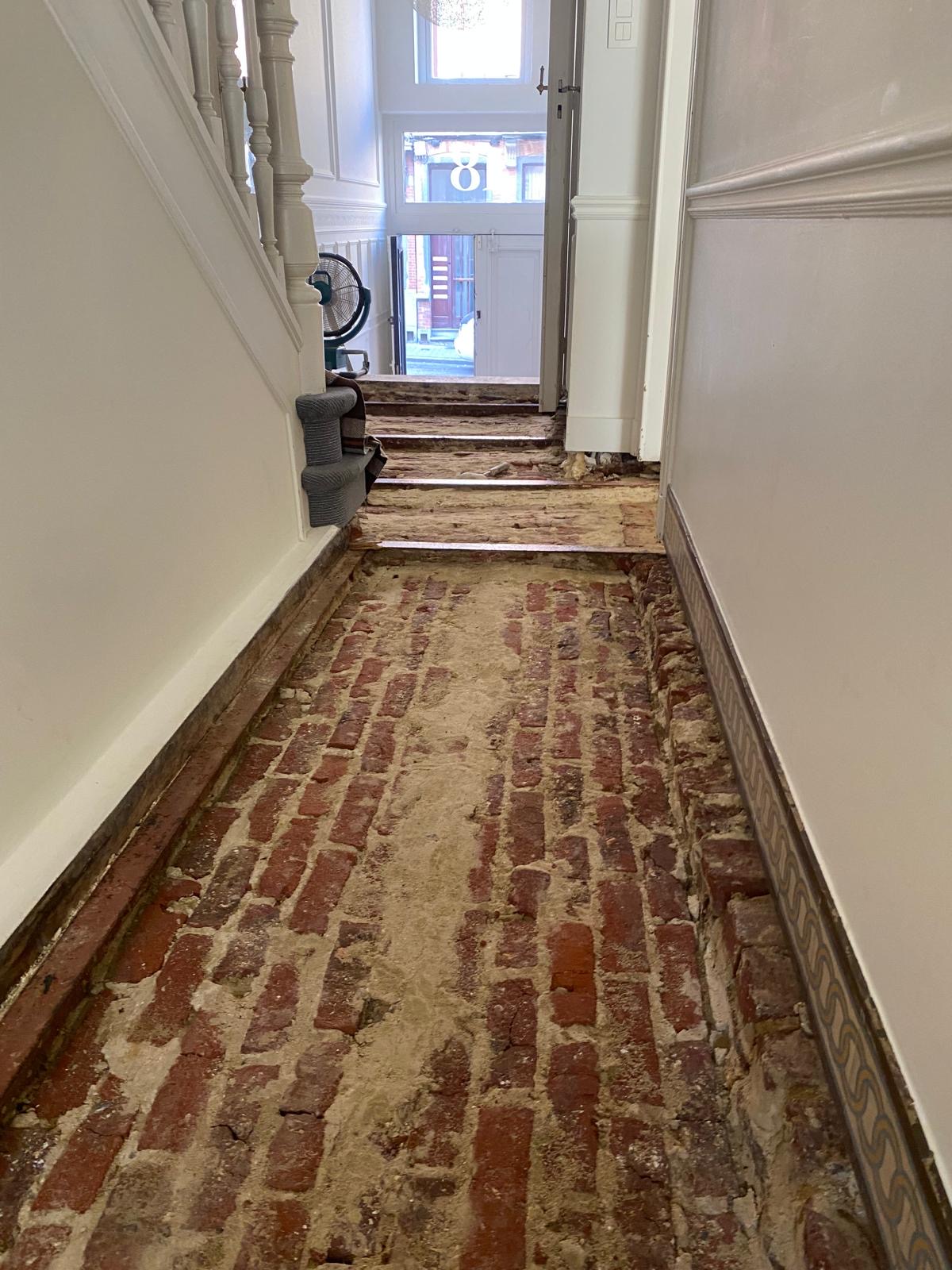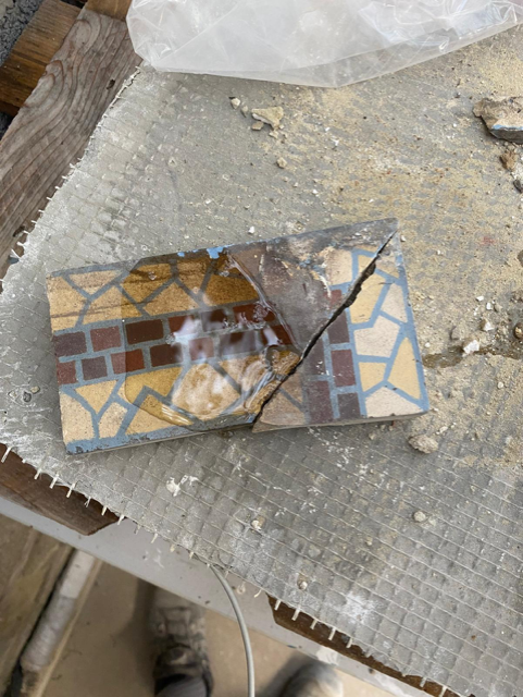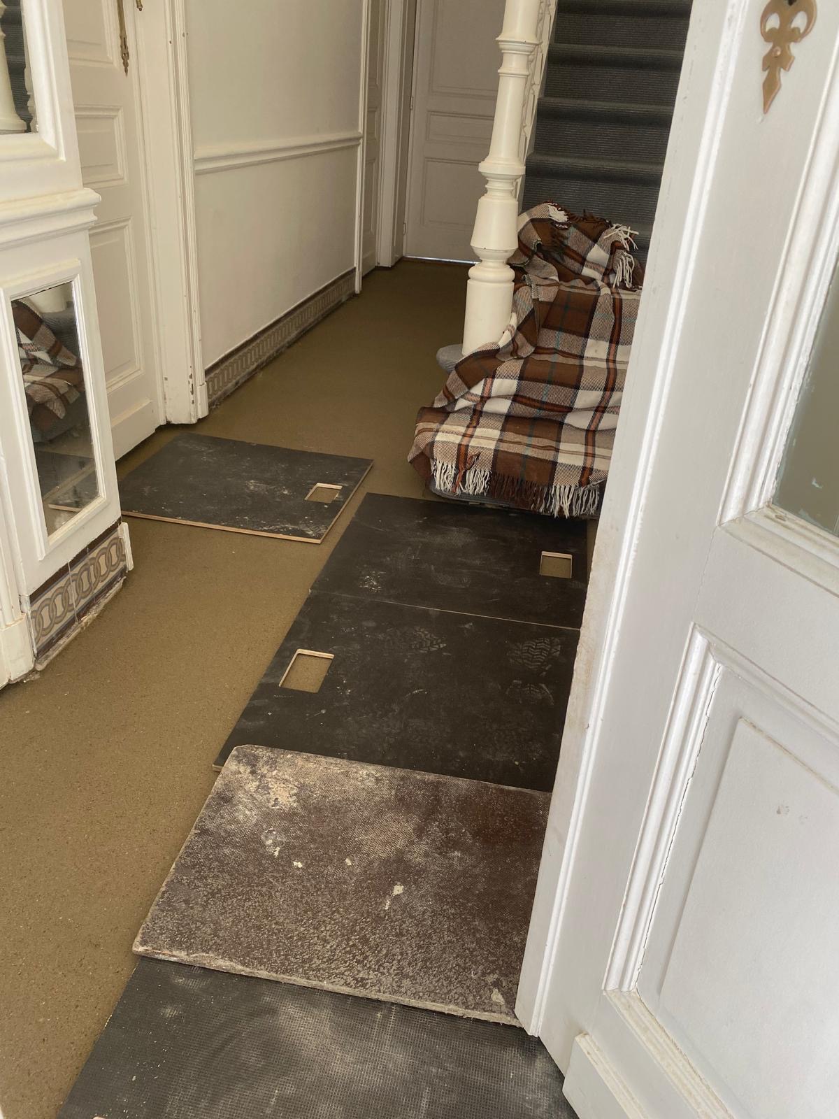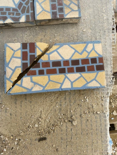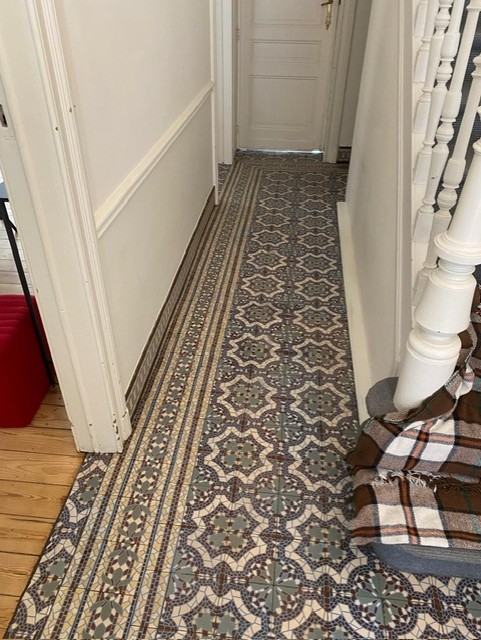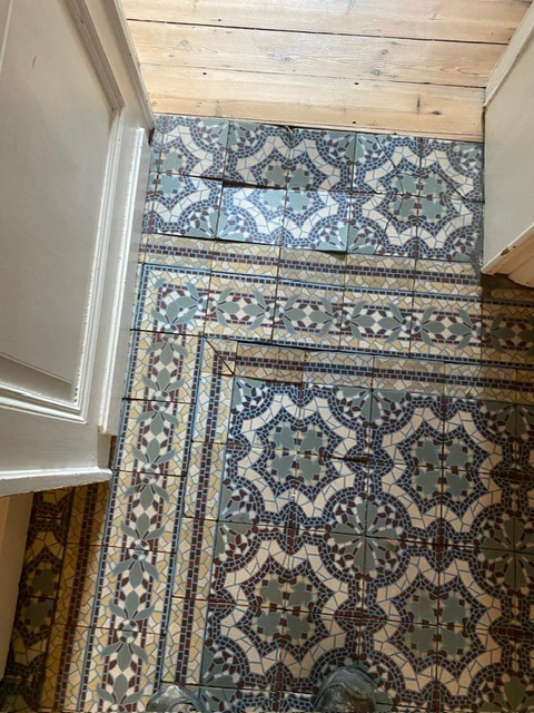 Le hall d'entrée de cette maison 1900 comportait beaucoup de carreaux cassés et descellés. Le travail a consisté en un démontage de l'ensemble, avec la numérotation des carreaux préalable.