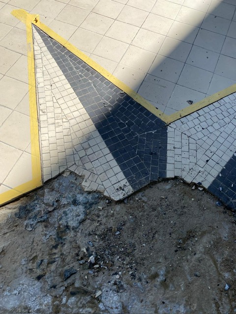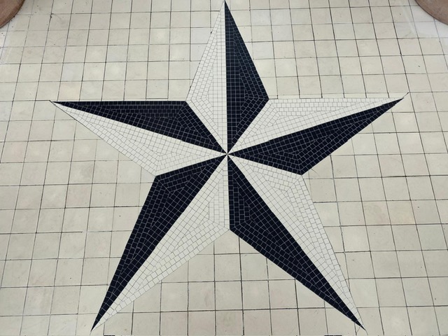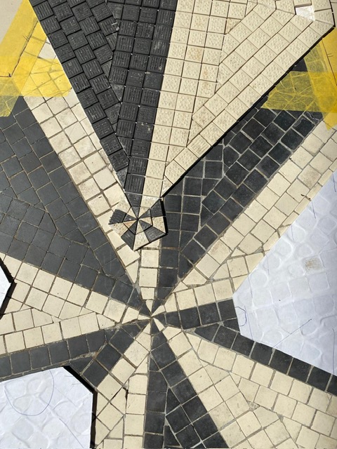 L’artisan a entrepris le nettoyage en profondeur des carreaux de céramique avant le remplacement complet d’une étoile de mosaïque.