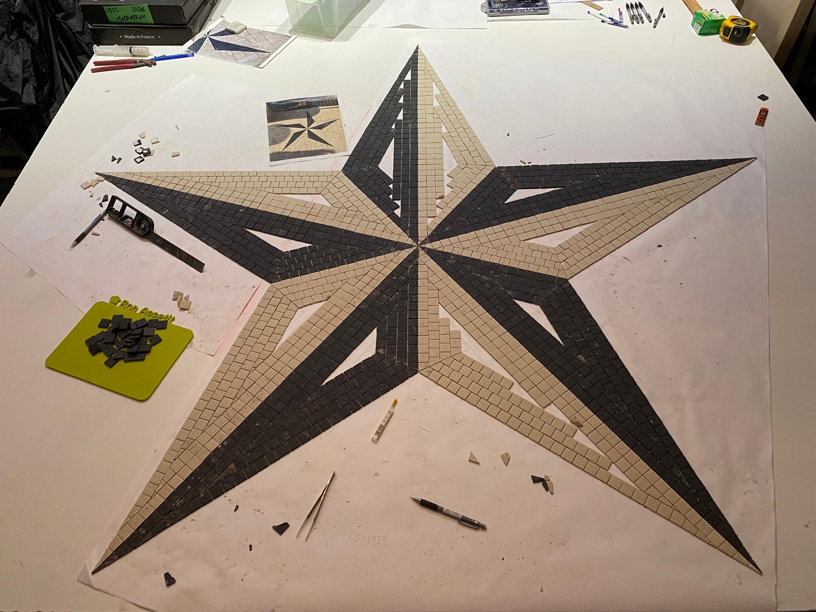 Pour cela il a reproduit le dessin sur calque, déposé entièrement la mosaïque avant de la reconstituer et de remplacer les tesselles manquantes. A cette fin il y a eu un remplacement complet d’une étoile et la restauration de deux autres étoiles avec les tesselles de cette première.