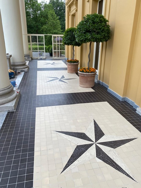 La terrasse extérieure de la galerie du château était composée de mosaïques cassées.
