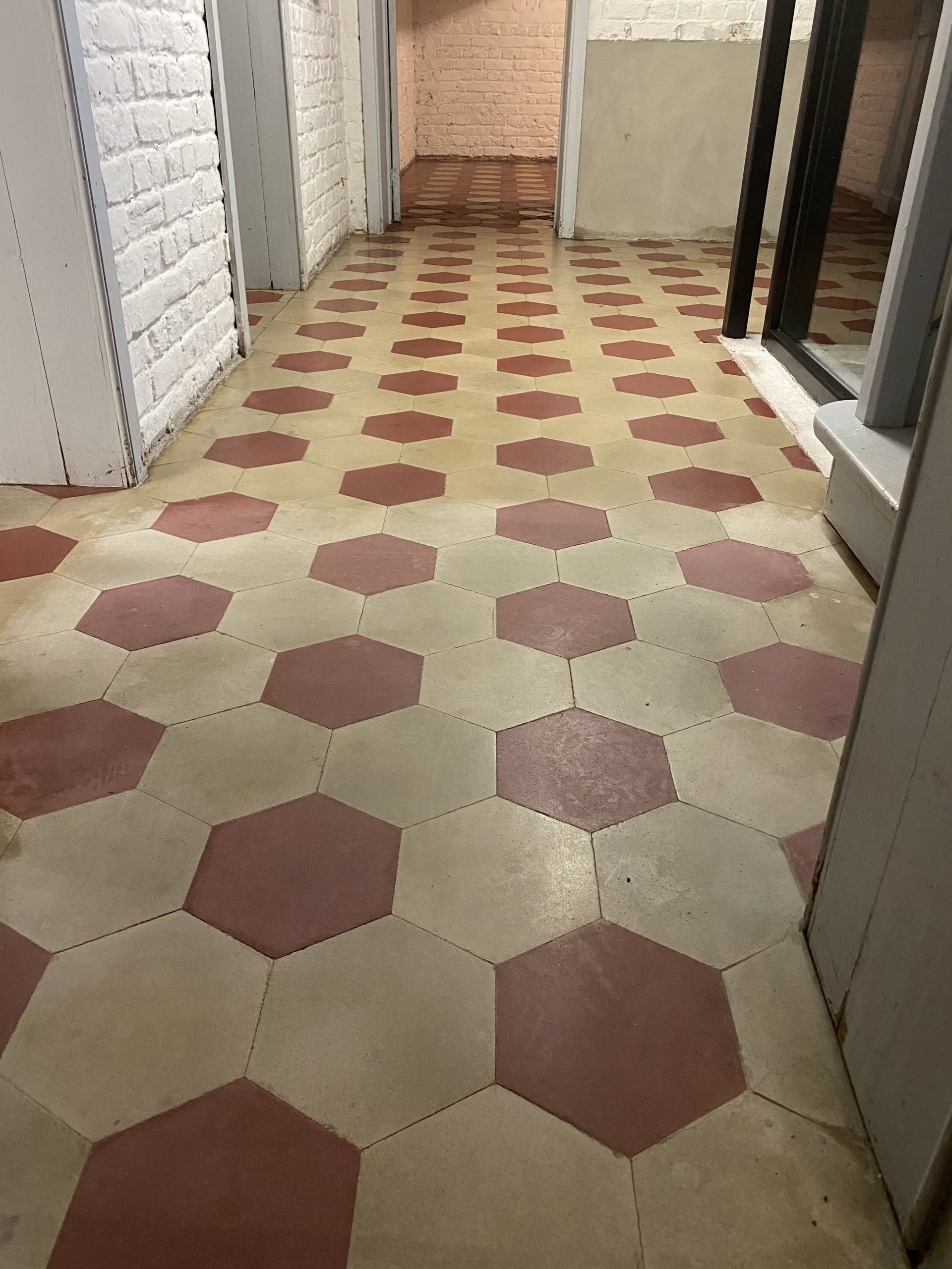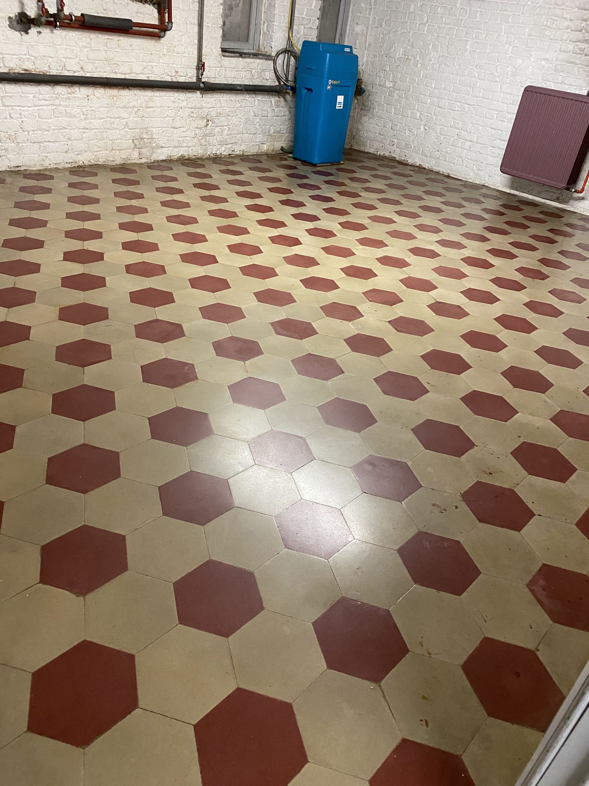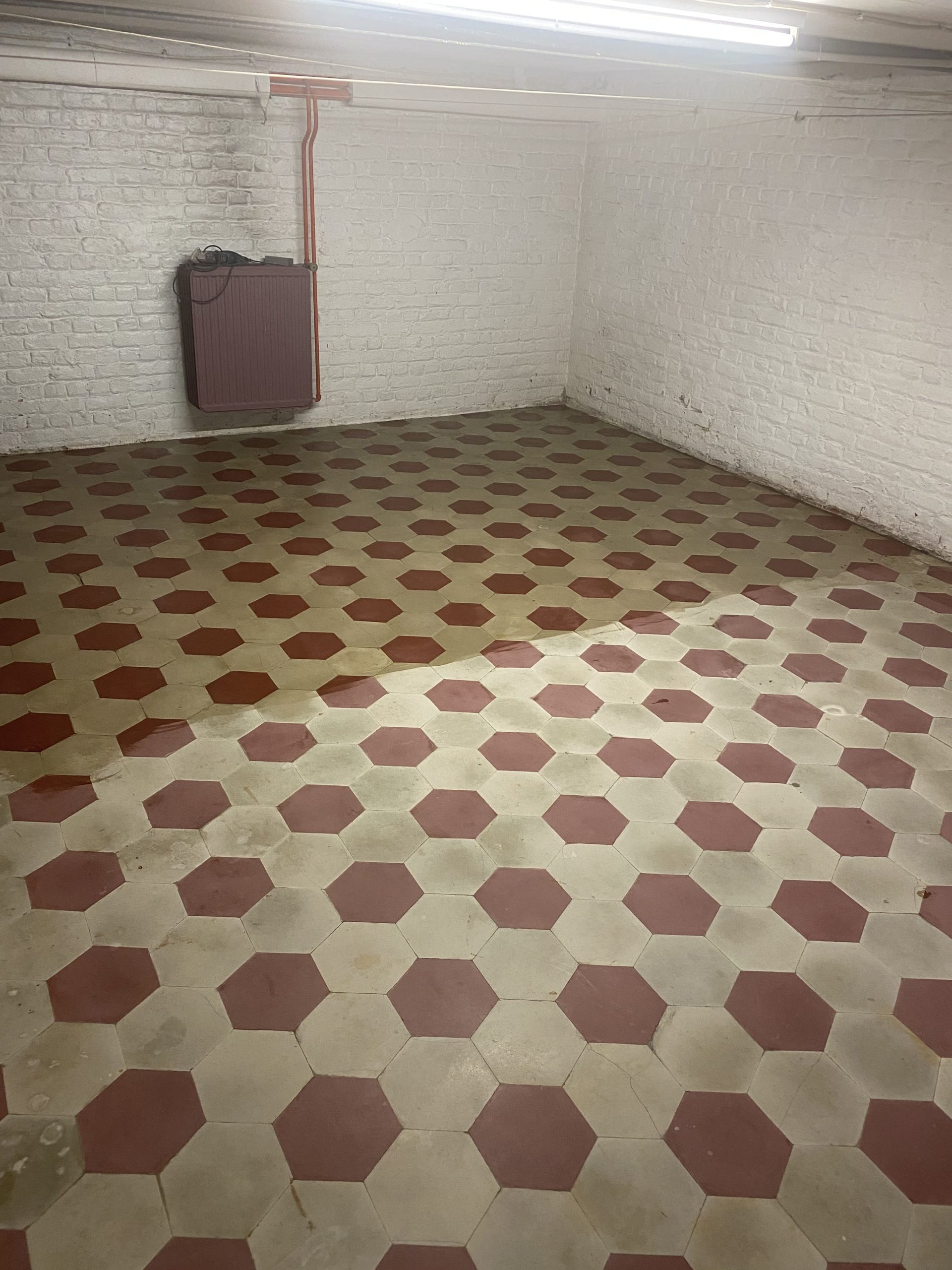 Rénovation d’un sol de cave en carreaux de ciment : nettoyage en profondeur, application d’un boucheur de pores, intensificateur de couleur et polissage.