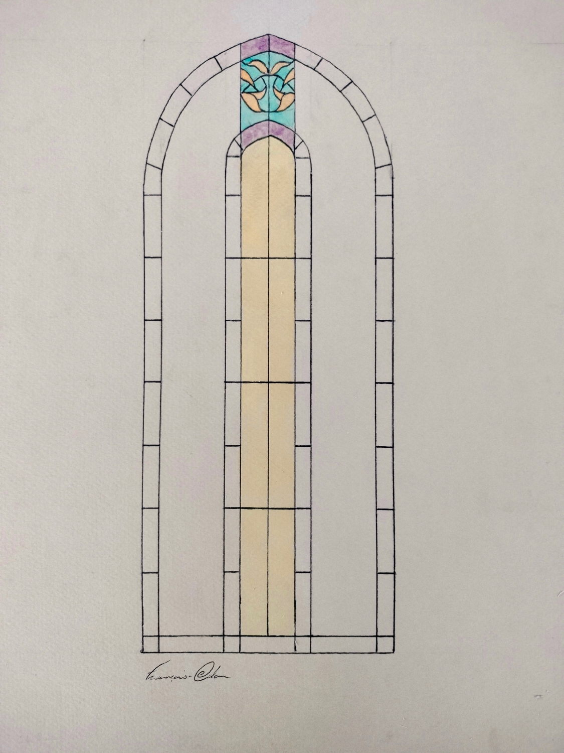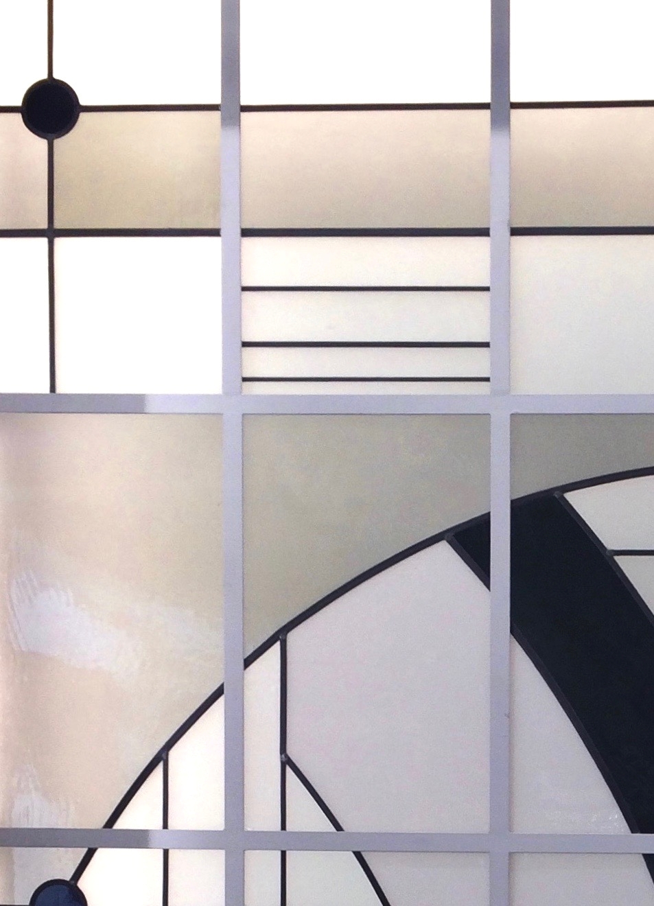 Les deux panneaux symétriques ont été restaurés, avec comme principe la conservation maximale de leurs verres d’origine. Ils ont été reliés par une nouvelle composition en verre. L’ensemble a ensuite été intégré à une porte en arc brisé.