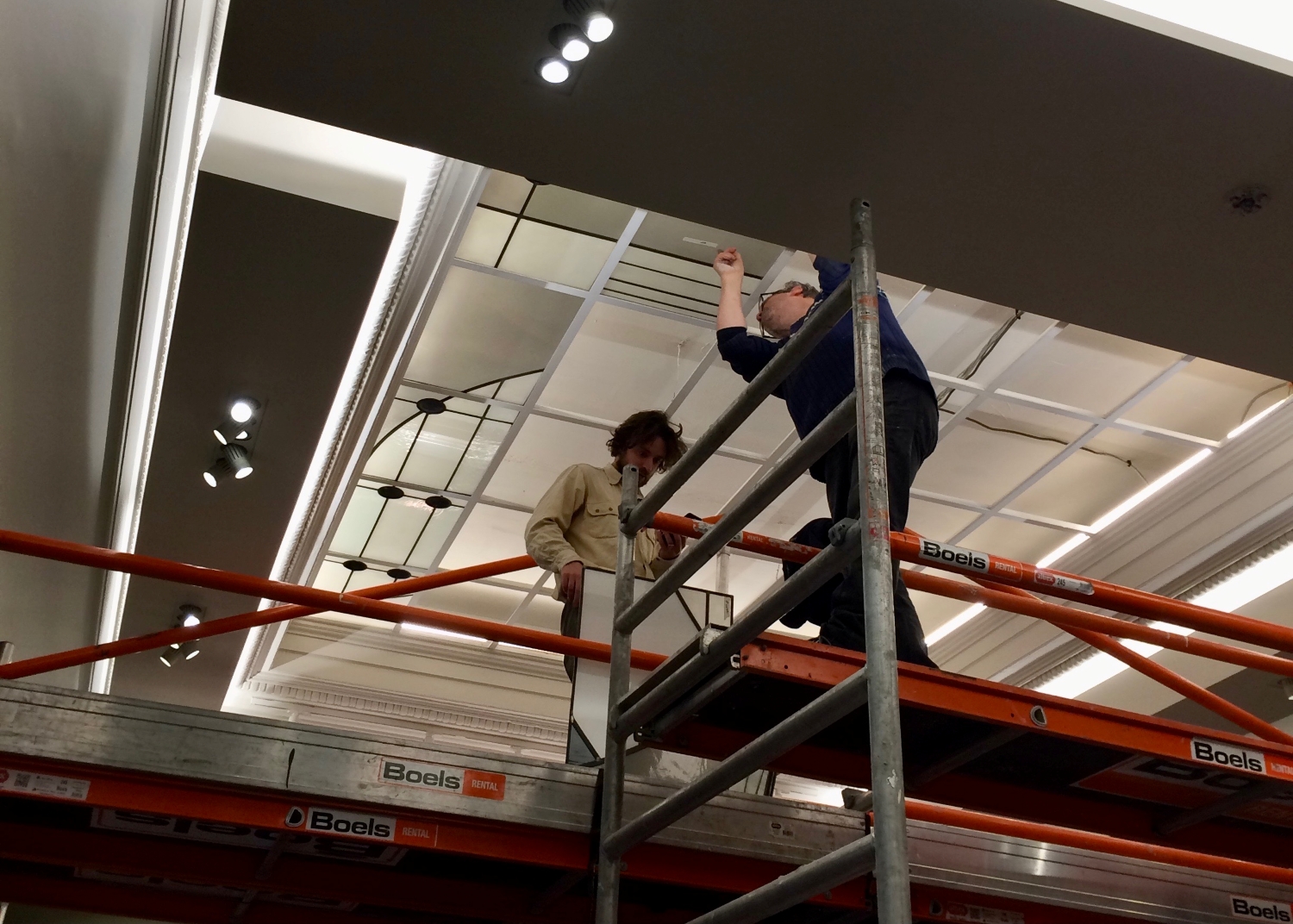 Rénovation d’un vitrail Art nouveau dont les deux panneaux, dissumulés entre deux cloisons, ont été redécouverts lors du chantier de rénovation d’un hôtel de maître.