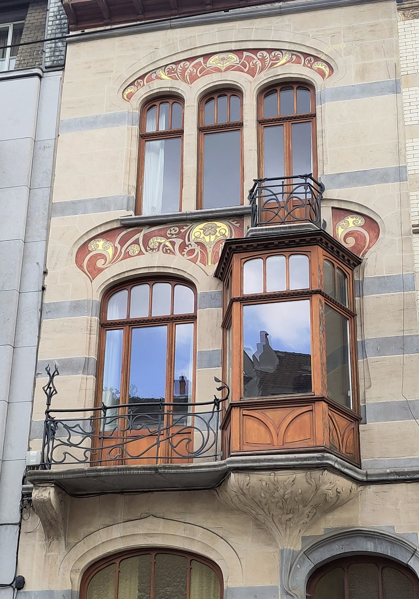 Datant de 1904, les éléments ouvragés de garde-corps des balcons ont été remis en état à l'atelier. Après démontage des ferronneries, l’ensemble a été sablé pour enlever les couches de peinture afin de vérifier l’état des pièces métalliques et les réparer si nécessaire. Les parties manquantes des garde-corps, comme des éléments décoratifs, ont été restitués à l’identique, sur base de l’existant et de l’iconographie encore à disposition, ce qui permet désormais une plus grande lisibilité de l’ensemble. La remise en peinture des balustrades a été effectuée manuellement (à la brosse et au pinceau) et selon la gamme chromatique retrouvée in situ via des sondages.